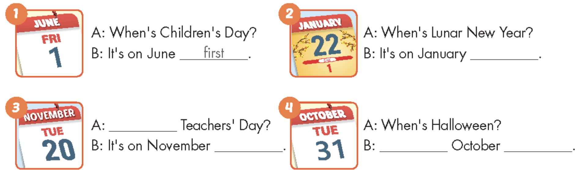 F. Ask and answer questions about when holidays are.
