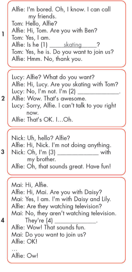 1. Alfie: Mình chán quá. Oh, mình biết rồi. Mình có thể gọi cho những người bạn.