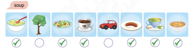 (Điền dấu tick vào các bức tranh về thức ăn và đồ uống. Nói.)