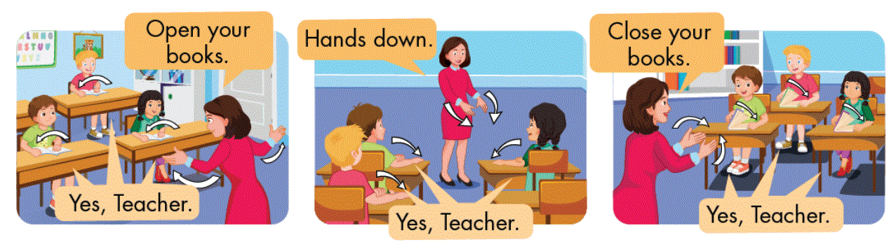 (Các em đóng sách lại. – Vâng, thưa cô.)