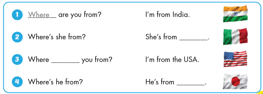 (She’s / He’s) from ___. (Cô ấy / Anh ấy đến từ ___.)