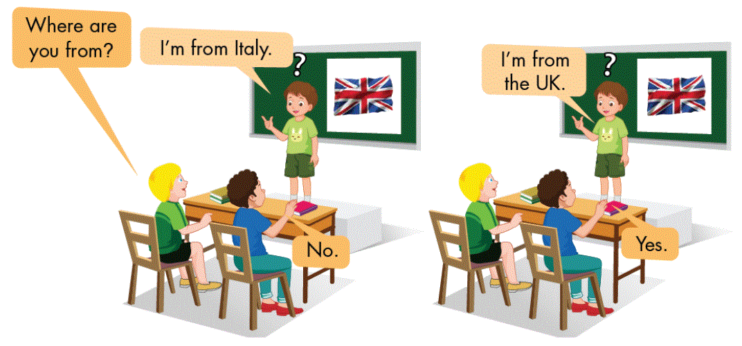 Ví dụ: Các bạn dưới lớp sẽ đặt câu hỏi gợi ý là bạn từ đâu đến:“Where are you from?”, bạn chơi không được quay lại nhìn bảng và đoán “I’m from Italy.” hoặc “I’m from the UK.”…