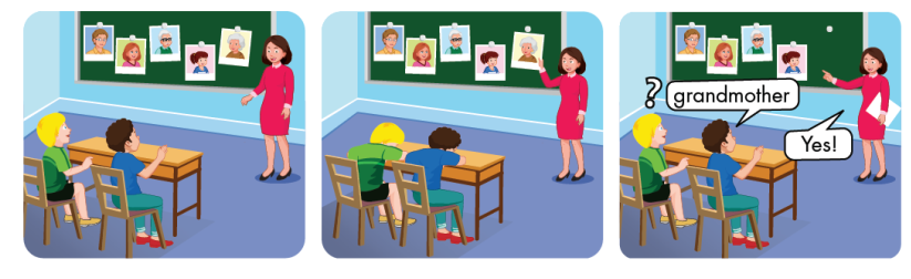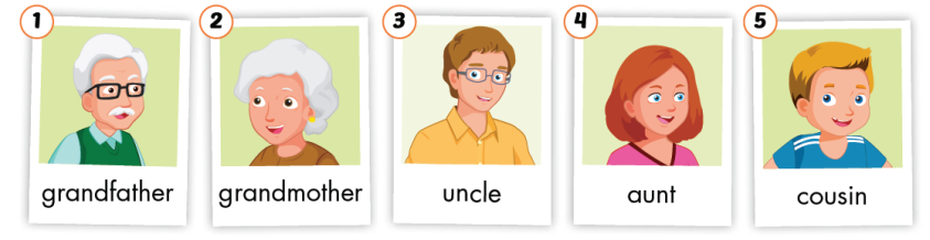 A. 1. Listen and point. Repeat. 2. Play Heads up. What’s missing? B. 1. Listen and practice. 2. Look and write. Practice. C. 1. Listen and repeat. 2. Chant D. 1. Look and listen. 2. Listen and circle. 3. Practice with your friends. E. Point, ask and answer. F. Draw your family. Ask and answer.