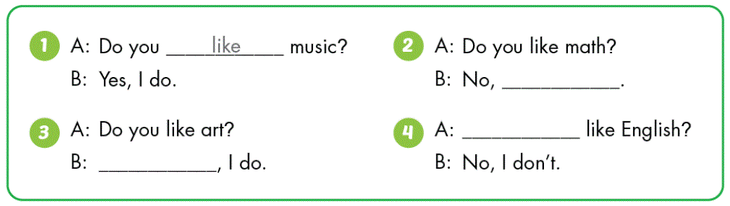 4. A: Do you like English? (Bạn có thích môn tiếng Anh không?)