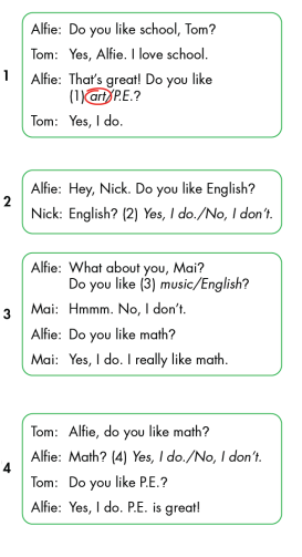 Alfie: Math? (4) Yes, I do./No, I don’t. (Toán sao? Không, tớ không thích.)