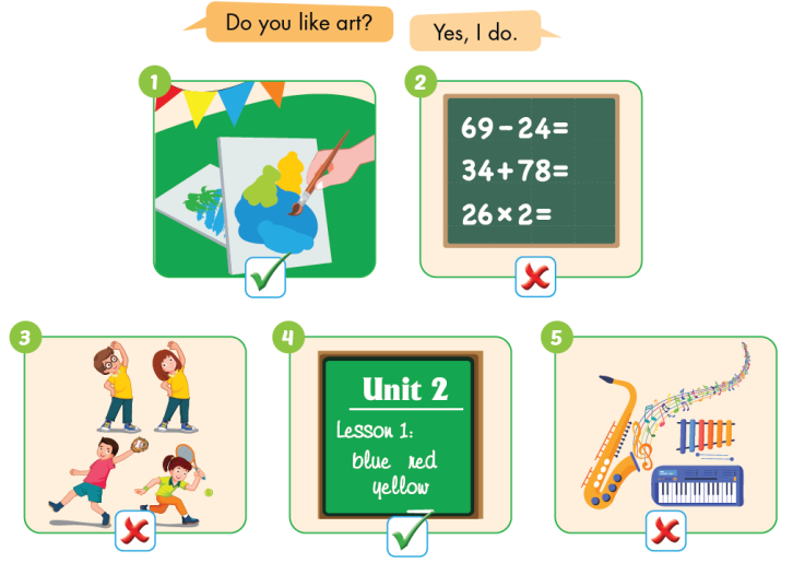 1. A: Do you like art? (Bạn có thích môn mĩ thuật không?)
