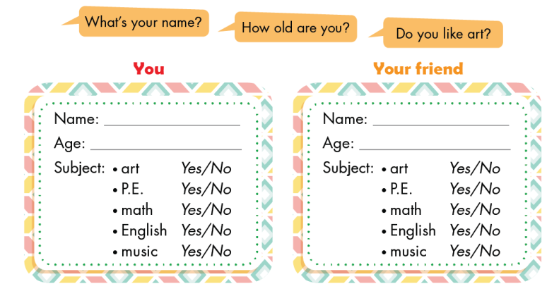A. 1. Listen and point. Repeat. 2. Play Four corners. B. 1. Listen and practice. 2. Fill in the blanks. Practice. C. 1. Listen and repeat. 2. Chant D. 1. Look and listen. 2. Listen and circle. 3. Practice with your friends. E. Point, ask and answer. F. Play Fill in the school form. Ask, write and circle.