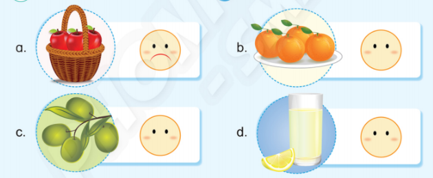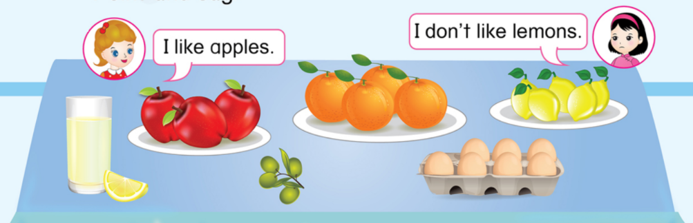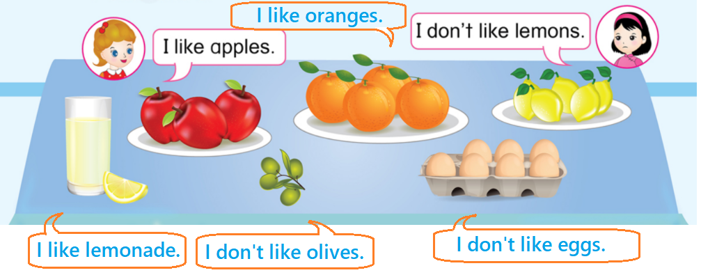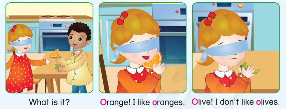 (Quả cam! Tôi thích cam. Quả  Ôliu! Tôi không thích ô liu.)
