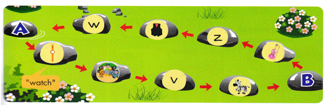 Cách chơi: Bước vòng theo các viên đá, ví dụ người chơi dừng ở viên đá có hình đồng hồ đeo tay thì đọc từ “ watch” lên.