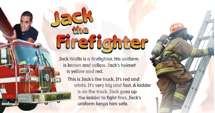 Jack Wallis is a firefighter. His uniform is brown and yellow. Jack’s helmet is yellow and red.