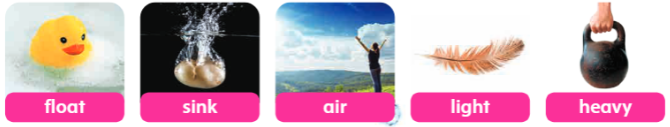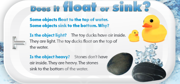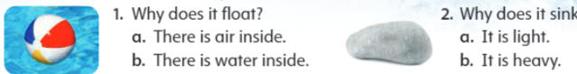Listen, point, and repeat. Listen and read. Read and write a or b. Which objects are light and float? Which objects are heavy and sink? Make a poster.
