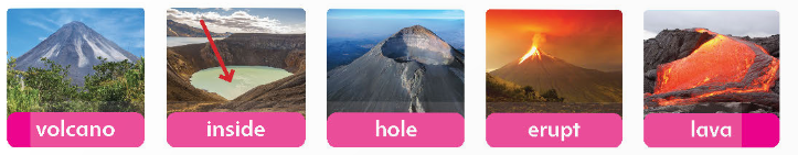 Listen, point, and repeat. Listen and read. Read again and write T (true) or F (false). What happens when a volcano erupts? Make a poster. Look and color.