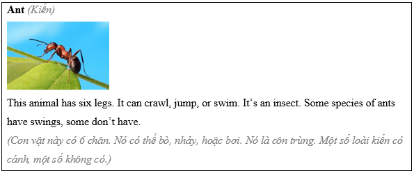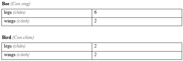 (Con ong: Con vật này có 6 cái chân. Nó là 1 loài côn trùng. Nó có 2 cánh.)