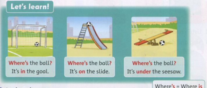 + Where’s the ball? => It’s under the slide.
