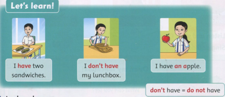 I don’t have my lunchbox. (Tôi không có hộp cơm trưa.)