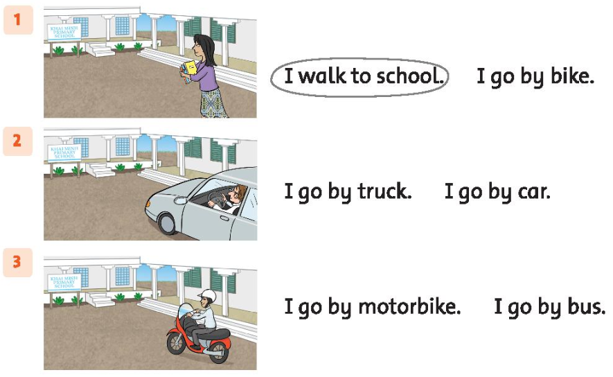 3. I go by motorbike. (Tôi đi bằng xe máy.)