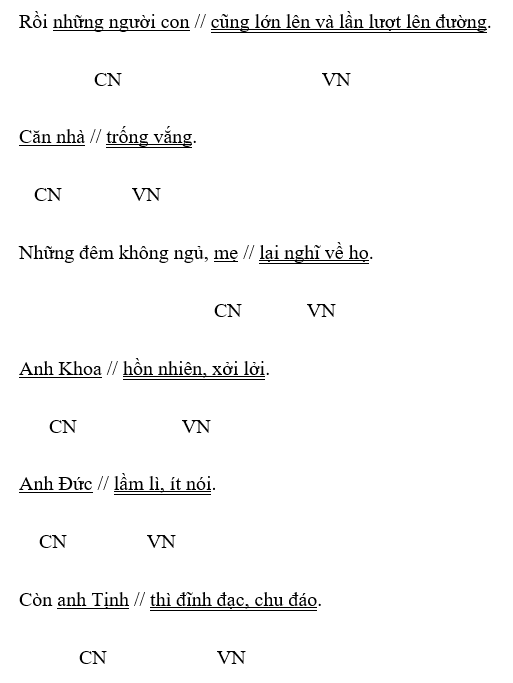 Rồi những người con cũng lớn lên và lần lượt lên đường. Căn nhà trống vắng. Những đêm không ngủ, mẹ lại nghĩ về họ. Anh Khoa hồn nhiên, xởi lởi. Anh Đức lầm lì, ít nói. Còn anh Tịnh thì đĩnh đạc, chu đáo.