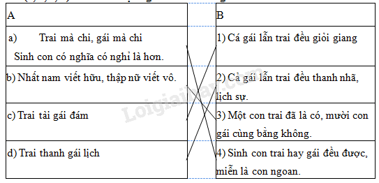 Nối thành ngữ, tục ngữ ở cột A với nghĩa thích hợp ở cột B. Khoanh tròn kí hiệu (a, b, c, d) trước câu tục ngữ mà em không tán thành.
