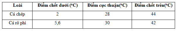 Theo dõi về giới hạn chịu nhiệt của cá chép và cá rô phi ở Việt Nam, người ta thu được bảng số liệu sau: