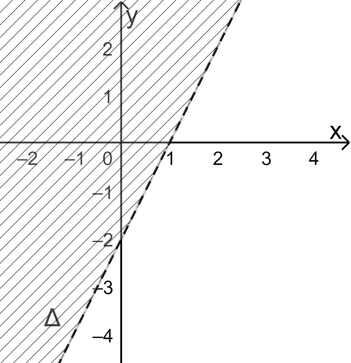 Vậy miền nghiệm là nửa mặt phẳng (không kể bờ \(\Delta \)) không chứa điểm \(O(0;0)\) (miền không gạch chéo).