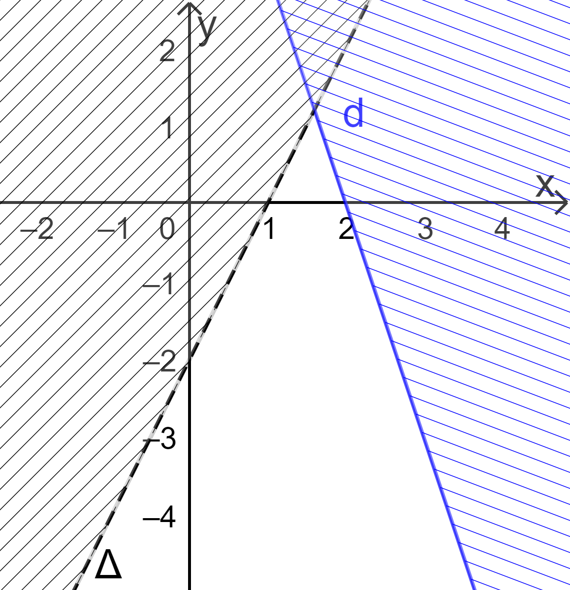 Miền không bị gạch (kể cả d, không kể \(\Delta \)) là miền nghiệm của hệ bất phương trình đã cho.