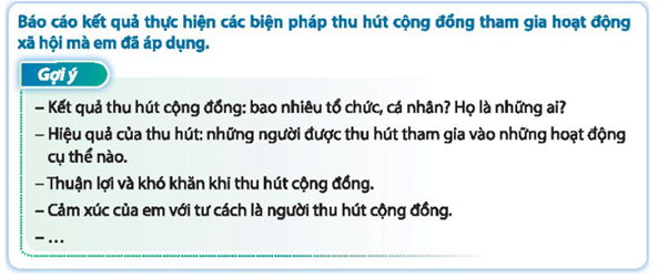 + Kết quả thực hiện các biện pháp thu hút cộng đồng tham gia hoạt động xã hội mà em đã áp dụng: Bao nhiêu tổ chức, cá nhân, họ là ai?