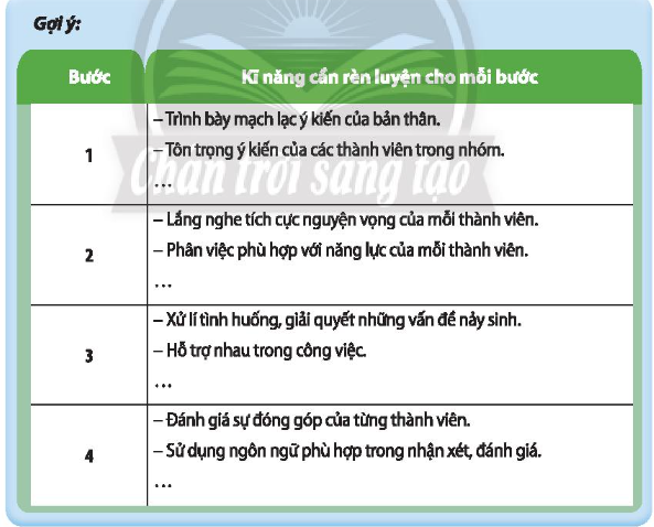 Chỉ ra  nội dung cụ thể của các bước hợp tác thực hiện nhiệm vụ chung và những kĩ năng cần rèn luyện trong mỗi bước.