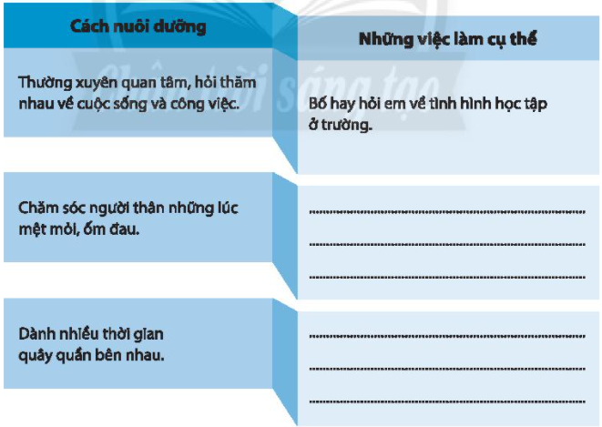 Viết những việc làm thể hiện sự quan tâm, chăm sóc của em đến các thành viên trong gia đình vào bảng sau: