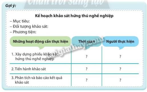Phương pháp giải: Tìm hiểu và dựa vào gợi ý để lập kế hoạch khảo sát hứng thú nghề nghiệp của học sinh.
