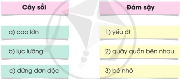 1) Ghép đúng để được các cặp từ ngữ nói lên những đặc điểm trái ngược nhau giữa cây sồi và đám sậy.