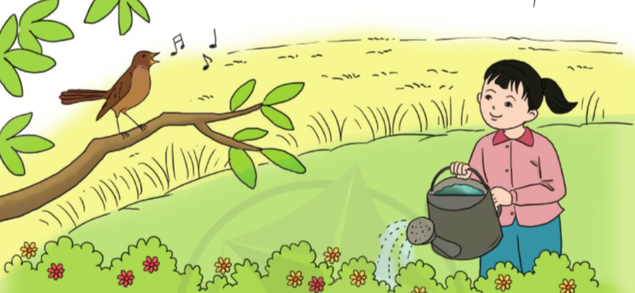 – “Tiếng chim cùng bé tưới hoa / Mát trong từng giọt nước hòa tiếng chim”.