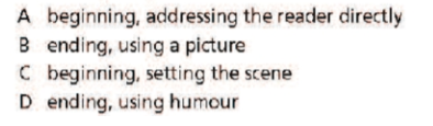 1. Read the extracts. Decide which are beginnings and which are endings. Which sets the scene? Use humour? Address the reader directly? Uses a picture?