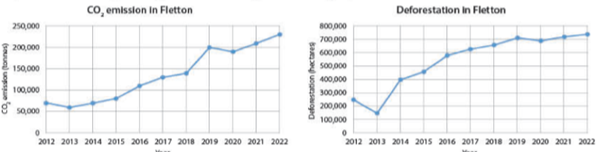 The graph on the right shows deforestation rates in Fletton increased rapidly from 2013 to 2022.