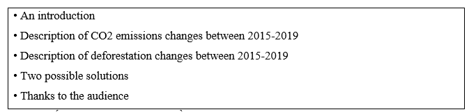 a. Listen to Joe and Emma giving a presentation about air pollution in their town and circle the phrases you hear. b. In pairs: Practice pointing to and talking about the graphs. In pairs: Choose a name for a town and complete the table about CO2 emissions and deforestation. Note two possible solutions. a. You're going to deliver a presentation with a friend about causes of air pollution in your town and potential solutions. Turn to page 125 and use the Presentation Model to help you write your