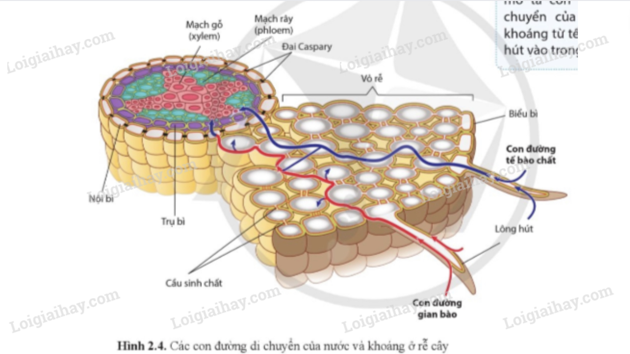 • Vận chuyển nước và khoáng từ lông hút vào mạch gỗ của rễ:  theo 2 con đường là con đường gian bào và con đường tế bào chất