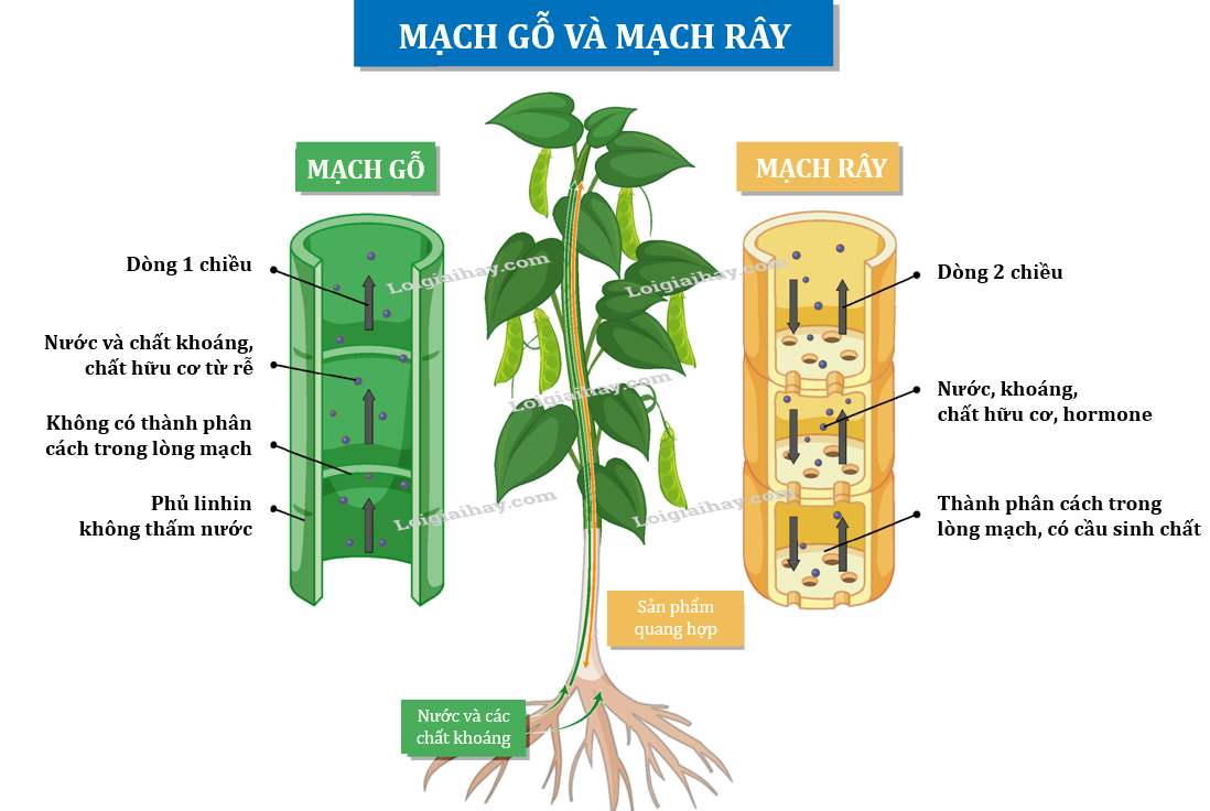 • Dòng mạch rây (dòng đi xuống): vận chuyển các chất hữu cơ được quang hợp từ lá đến nơi cần sử dụng hoặc dự trữ trong rễ, hạt, củ, quả…