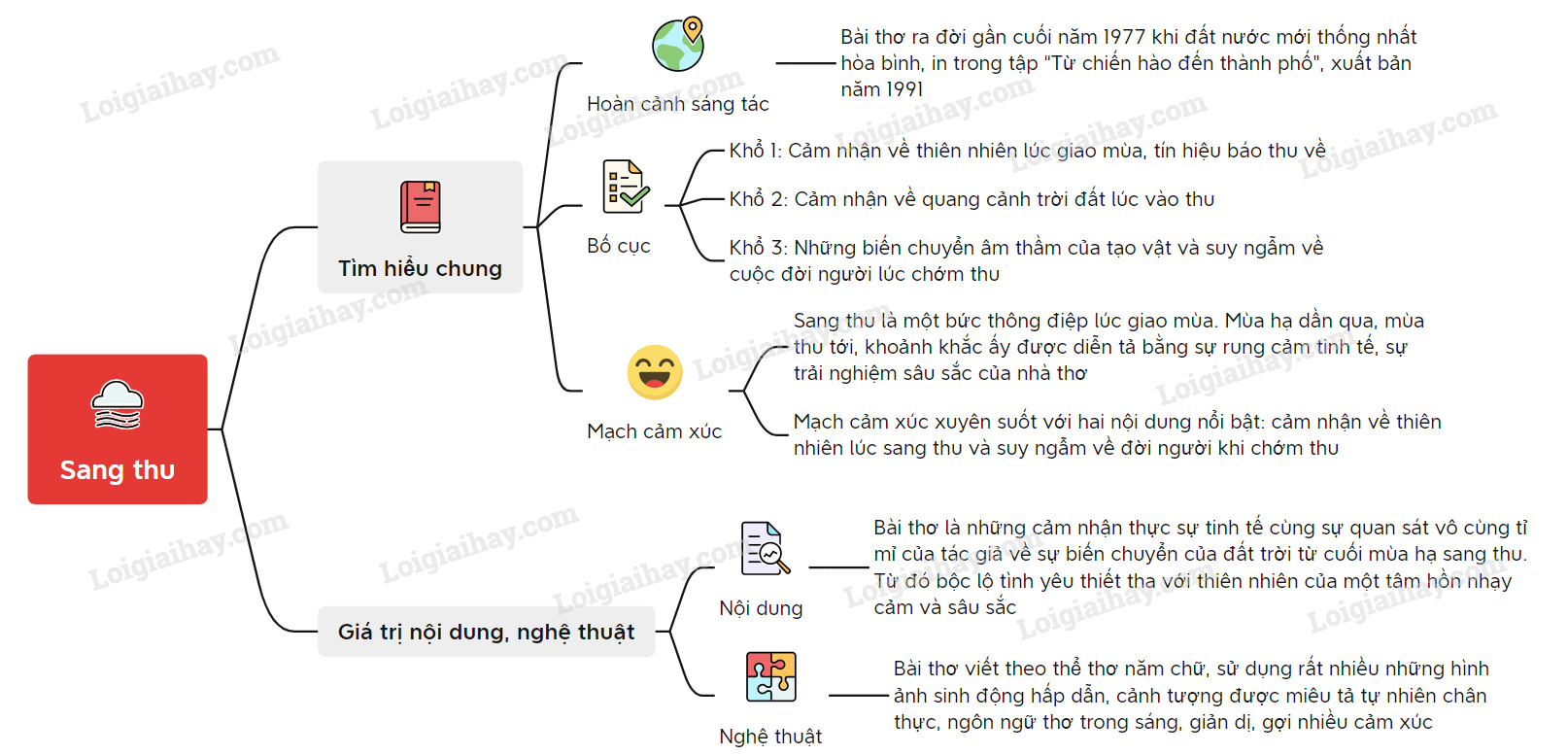 – Sang thu là một bức thông điệp lúc giao mùa. Mùa hạ dần qua, mùa thu tới, khoảnh khắc ấy được diễn tả bằng sự rung cảm tinh tế, sự trải nghiệm sâu sắc của nhà thơ. Mạch cảm xúc xuyên suốt với hai nội dung nổi bật: cảm nhận về thiên nhiên lúc sang thu và suy ngẫm về đời người khi chớm thu
