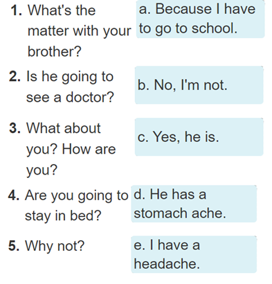1 – e: What’s the matter with your brother? – He has a stomach ache.