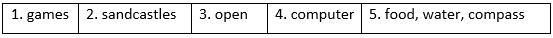 5. Name one thing we should bring along when camping food/ water/ compass.