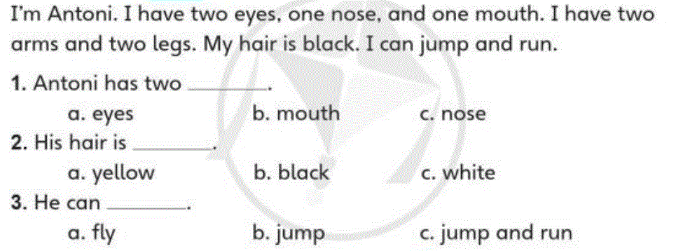 I’m Antoni. I have two eyes, one nose, and one mouth. I have two arms and two legs. My hair is black. I