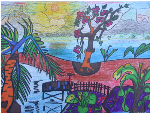 Em đã sử dụng đường nét nhỏ để làm nổi hình ảnh, màu sắc trong tranh. Về hình khối: em sử dụng những hình khối cơ bản: chữ nhật, vuông tròn….để vẽ tranh. Màu sắc được em sử dụng đa dạng, có đậm có nhạt, tương phản.