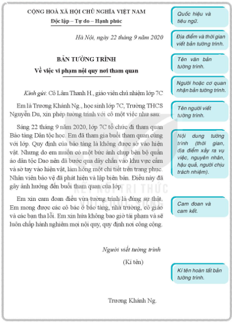 – Ghi lời cam đoan về sự khách quan, trung thực của nội dung tường trình cùng lời hứa hoặc đề nghị đối với người (cơ quan) xử lí vụ việc