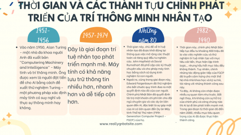 Hãy sử dụng phương tiện phi ngôn ngữ để tóm tắt các mốc thời gian và các thành tựu chính trong quá trình phát triển của trí thông minh nhân tạo. Các thông tin đó gợi cho bạn suy nghĩ gì?