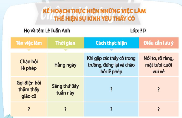 Kế hoạch thực hiện những việc làm thể hiện sự kính yêu thầy cô