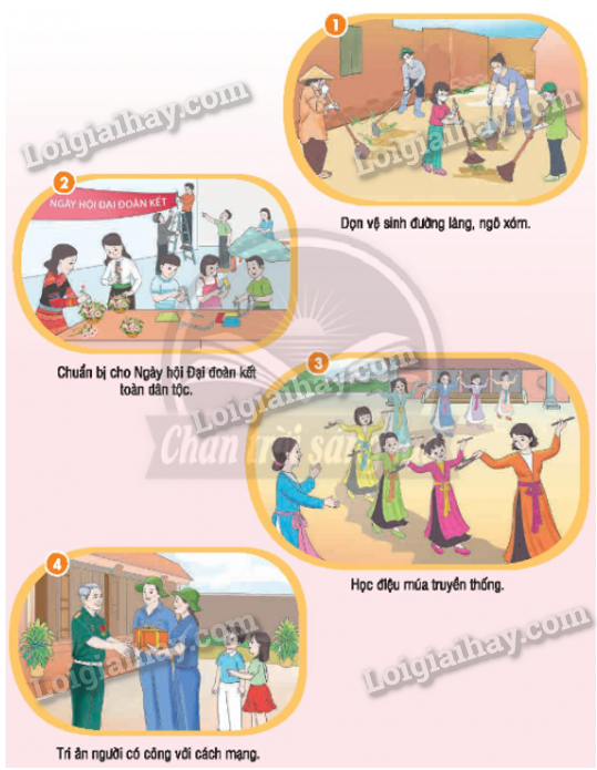 Tranh 2: Tranh vẽ mọi người đang cùng nhau chuẩn bị Ngày hội Đại đoàn kết toàn dân tộc. Đây là hoạt động diễn ra hằng năm ở các khu dân cư/ thôn xóm và thường được tổ chức vào ngày 18-11 hằng năm. Mọi người đang chuẩn bị rất tích cực, các bạn nhỏ thì giấy, các bác gái thì cắm hoa, các bác trai thì treo khẩu hiệu. Nếu tham gia hoạt động, em có thể cắt giấy cùng các bạn, quét dọn hội trường, cắm hoa, chuẩn bị nước uống cho mọi người,… Việc cùng nhau chuẩn bị cho ngày hội Đại đoàn kết giúp mọi người gần gũi và gắn bó với nhau hơn.