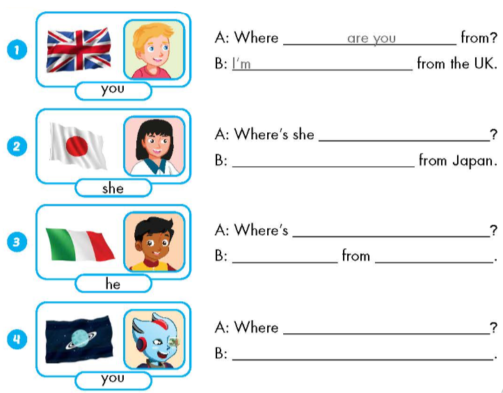 1. A: Where’s he from? (Anh ấy đến từ đâu?)