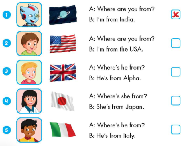 B: He’s from  Alpha. (Anh ấy đến từ hành tinh.)