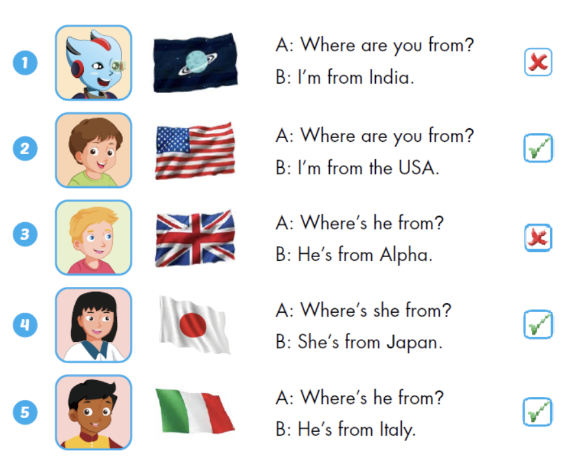B: He’s from Alpha. (Anh ấy đến từ hành tinh An-pha.)