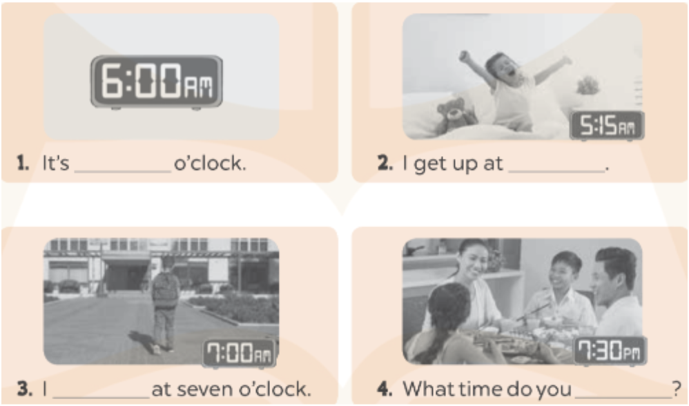 1. It’s six o’clock. (Bây giờ là sáu giờ.)