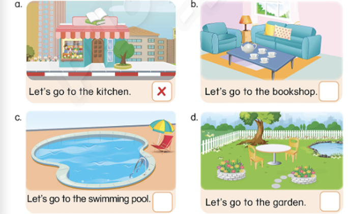 b. Let’s go to the bookshop. (Hãy đi đến nhà sách.)